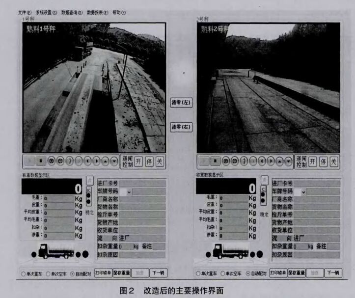 图2中,整个主操作界面是分1号秤区和2号秤 区,两个秤的操作功能是一样的,视频控制区可以控 制摄像头云台的控制,包括视频的断开、连接。主界 面相关操作模块功能介绍如下。