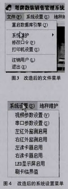 (2)系统设置菜单 见图4。其中视频参数 设置:配置视频服务器 的连接参数;串U参数 设置:配置所有要用到 串口的连接参数;左右 红外监测启用:开启/关 闭红外监测,当关闭时 红外监测失效;LED显 示屏启用:开启/关闭 LED屏的显示,当关闭时即使LED显示区 内有内容也不会显示 到LED屏上去;刷卡 临界值:设定地枰重 量到多少时自动启动 读卡器读卡,默认为2500kg,也就是说低于这个重量则读卡器不工作。