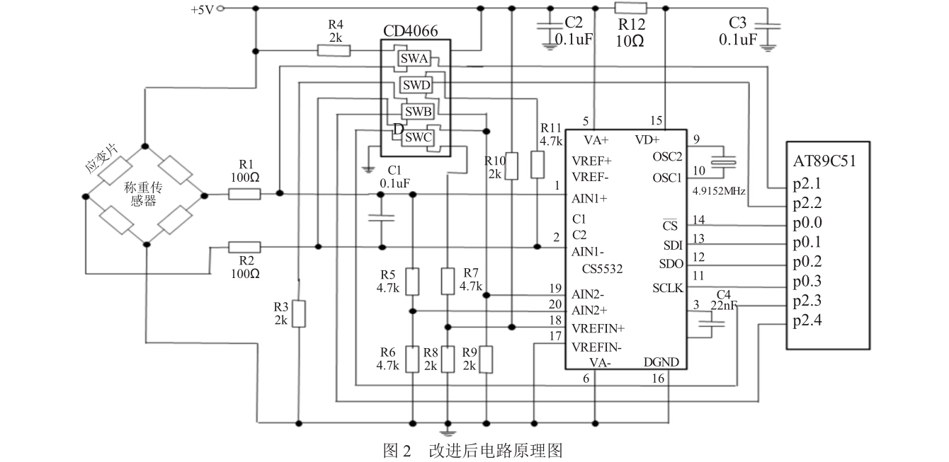 电路采用带放大器的双通道A/D的CS5532芯 片和电子开关CD4066芯片等元器件,组成了对称 重传感器输出电阻、供桥电压、A/D芯片的参考电 压检测电路。