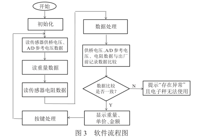 软件流程图如图3所示,当电子计价秤开机 进行初始化后,通过程序对模拟电子开关闭合和 断开的控制,分时从Ain1和Ain2对重量信号、传 感器电阻、传感器供桥电压及A/D参考电压等进 行采样,将采样数据转换结果送入单片机,与电 子计价秤出厂时被保存在存储器中原始数据进行 比较,如果数据判断一致的,则电子计价秤正常 工作,如果数据判断不一致,则认为电子计价秤 被人为改变或作弊,这时电子秤显示“存在异常” 的特定符号,禁止用户继续使用电子计价秤。
