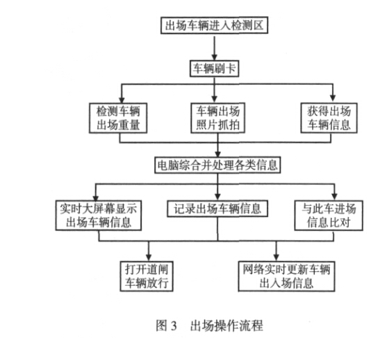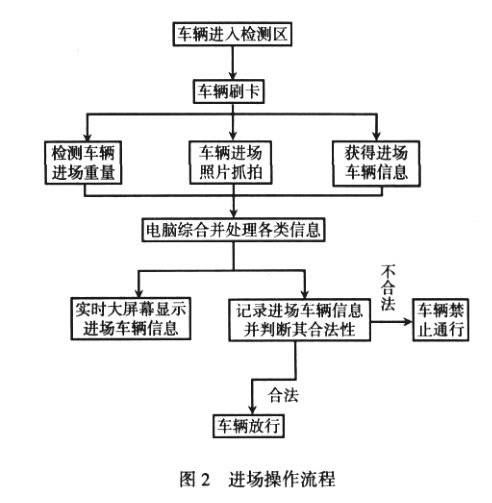 进入称重管理站的车在道闸前停下,此时道闸 为闭合状态。司机将记录有汽车车号等信息的非接 触式IC卡,靠近路边的IC卡读器,当系统识别成 功,并判别为合法车辆后,在操作室内称重管理计算 机的控制下,触发图像抓拍系统完成车牌的抓拍和 车牌号与图像的叠加,称重仪表控制器开始将秤台 传输的连续模拟电信号,转变成数字信号,经配套的 称重管理软件识别运算后,在称重管理计算机的操 作界面和户外显示屏上实时显示总重。在取得稳定 的称重结果后,车辆监测器将发出升闸信号,操作界 面就会显示出车辆总重(车辆皮重由车辆通过另一 车道时称量),则计算机自动计算并显示出净重,并 语音指挥通行。当汽车全部通过道闸后,在车辆检测 器的控制下,道闸栏杆会自动落下。每次称重的数据 均按车号对应存贮,构成称重管理数据库。称重管理 软件可提供多种查询、统计方式,并可随时打印称重 单据和报表。在系统自动检测完成后,实时自动传输 模块可以通过网络将车辆信息、货物种类、车辆净 重、车辆毛重、车辆抓拍图像、监控录像、自动生成的 各类报表等各种数据远距离传输到远程控制中心或 专业网站,如果中心服务器或通讯线路故障,系统故 障排除后,主控程序会自动判断网络和服务器状态, 对未上传的数据,自动的异步传输,无需任何人工的 干预,确保了数据的一致、完整、安全、快捷。管理部 门和各车辆运输用户单位,通过一台与Internet联 接的电脑,即可通过域名访问权限登陆到管理中心, 了解各点的实时运行情况和查询各种报表等。