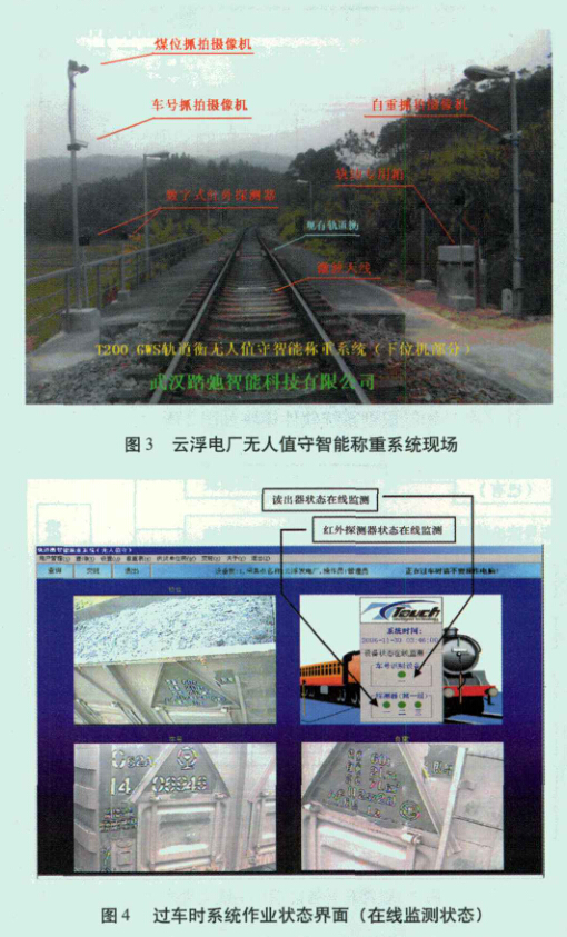 铁路车号智能识别系统(二代AEI)主要通过在现有的动 态轨道衡上加装铁路车号智能识别系统(二代AEI),实现轨道 衡全自动无人值守称重,计量人员可在厂部办公室远程完成过 衡的计量工作。系统在粤电集团有限公司云浮发电厂应用取得 了良好的效果,不仅实现了远程自动无人值守称重,节约了人 工成本,减少了人为差错,而且大大提升了工厂作业的自动化 程度和信息化水平。系统现场运行及控制软件界面分别如图3 和图4所示。