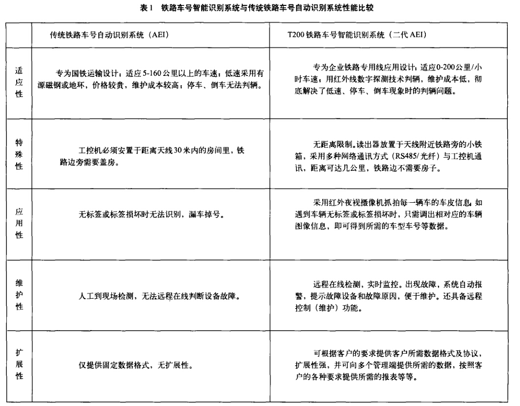 铁路车号智能识别系统(二代AEI)相对于传统的路车号 自动识别系统具有适应性强、可用性髙、便于维护、系统扩展 性好等诸多优点,因此,在实际应用过程中取得了良好的应用 效果。它与传统路车号自动识别系统性能的差异详情见下表1。