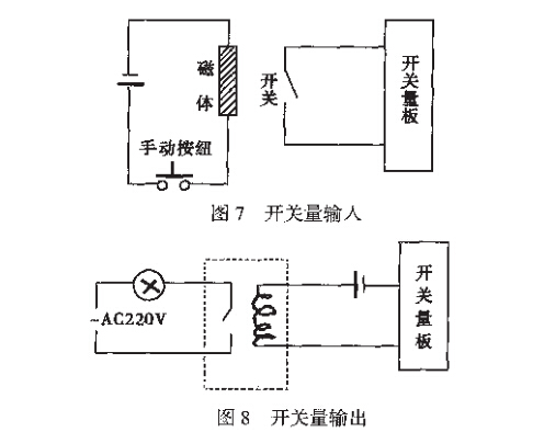 计算机借助外界开关量信号,来识别炉号及记 录毛皮数据,应用研华PCI-1750开关量输入/输出 板,利用两个磁接近开关为6#炉和7#炉各设一路 开关量输入信号。同时利用继电器控制指示灯形成 两路开关量输出。磁接近开关包括可分离的两部分: 电磁体和开关,磁体带电时开关吸合。具体安装如 下:①在每台加煤车的顶部并行安装两个磁接近开 关(6#开关和7#开关"的磁体部分,在每台加煤车 里的控制面板上安装两个舌簧按纽开关(6#按纽和7#按纽",按纽和磁体 对应,按图7连接。②在煤塔秤的正上方,高出加煤车车顶50mm处并行安 装两个磁接近开关的开关部分,使得加煤车停在秤 上计量时磁接近开关的磁体部分和开关部分能对应 起来,按下舌簧按纽,相应的磁接近开关吸合,开关 两端(无源"直接连入开关量板,形成计算机采集数 据和识别炉号的信号。之所以在一台加煤车上安装 两个按纽和两个磁体,用按纽控制磁体带电与否,而不采取磁体一直带电的方式,主要是解决一台加煤 车为两座焦炉加煤的问题。③利用指示灯作为成功 计量的指示信号,将继电器的线圈接入开关量板的输 出回路,常开触点接指示灯,具体连接方法见图8。
