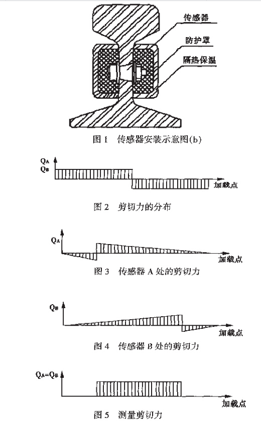 传感器外型呈圆锥形,需和标准钢轨配合使用 (见图1)。使用时将传感器按规定的装配工艺要求 装入轨腰孔内并锁紧,当钢轨受到压力作用时,装 在轨腰处的传感器便产生一个与剪切力成正比的 输出信号(见图2~图5)。