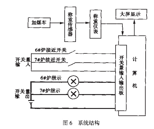 焦炉加煤与计量流程通常是这样的,空加煤车 进入煤塔秤稳定后,计量皮重!对应上个炉孔",然后 加煤车移至需要加煤的煤仓下,打开下料口自动加 煤,装满后加煤车再移至秤上,计量毛重!对应本次 应加煤的炉孔)。毛重与皮重相对应,计算出加入一 个炉孔的煤的净重。以前计量全由专职司磅员手工 记录与统计,手续繁琐、出错率高,这次我们在6、7# 焦炉煤塔秤中实施了无人值守计量!无需专职司磅 员",炉孔号自动匹配,同时对数据进行统计分析,打 印各类报表。系统结构见图6。