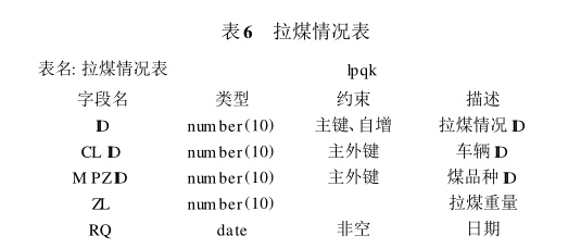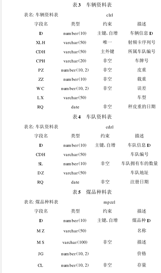 本数据库釆用Oracle 9i,Oracle 9i是一款非常出色的数据库软件,其性能稳定且安全,是重要数据的理 想选择。数据库用来存储车辆的信息,如:车辆信息、车 队信息、拉煤的品种、拉煤量、拉煤的日期等等信息,以 便于监控人员对信息的核对和领导层对于煤炭的开釆 量和销路等等市场信息的决策。
