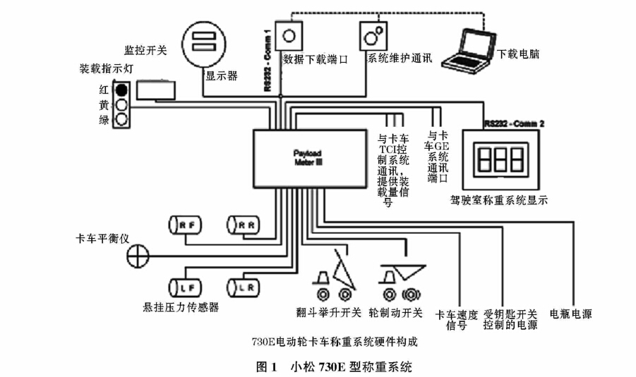 系统由1个有效载重量测量器、驾驶室显示仪 表、安装于左右平台的装载灯、4个悬挂压力传感器 和1个倾斜计,来自控制系统的辅助输人信号包括 翻斗举升信号、制动锁定信号和卡车速度信号。图 1为小松电动轮称重系统。