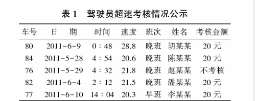 根据雪班电动轮卡车的作业区域及发生了超速 的时间可以推测出大致的违章地点按章X段规定 考核当班驾驶员,督促其改正不良的操作习惯。表 1为某一时段的公示情况。