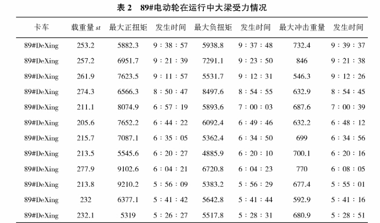 电动轮在运行过程中由4个悬挂通过大梁承载 重量4由于路面的变化,使4根悬挂承载的挺力发生 变化,因此可以通过统计某一时刻悬挂压力的变化 看出大梁的受力情况,对太梁扭矩发生的时刻和地 点进行整治,杜绝大梁发生早期疲劳裂纹,保障电动 轮设备的安全运行表2为_89#电动轮在12个运 输过程中出现了 2次超过极限扭矩的情况,表中最 大疋扭矩指在某一运输循环中前后4根悬挂间的大 粱承受的最太顺时针(面何电动轮前方)扭矩< m x t);最大负扭矩指在某一运输循环中前后4根悬挂 间的大梁承受的最大逆时针(面向电动轮前方)扭 矩(mxt);泰大冲责質量指窜霉一•运输植环中如请4 根悬挂揖力最大值。通过对其晚班作业道路的检 查,发现路面某处存在起伏较大的坑洼,及时通知相 关!t段进行处理。