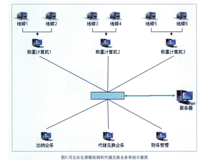 在系统中,每一台过磅计算机负 责两台地磅(因为每一个磅房建有两 台地磅),所有计算机通过局域网联 接起来,业务数据存放于专用服务器 中,每一台过磅计算机只能看到自己 的称重信息,避免互相干扰。计算机 间实现数据共享,即过磅数据直接传 递到出纳、代储兑换处,做到纸质单 据和电子信息互相对比,防止假冒单 据;同时出纳付款、代储办理结果反 馈到过磅处。
