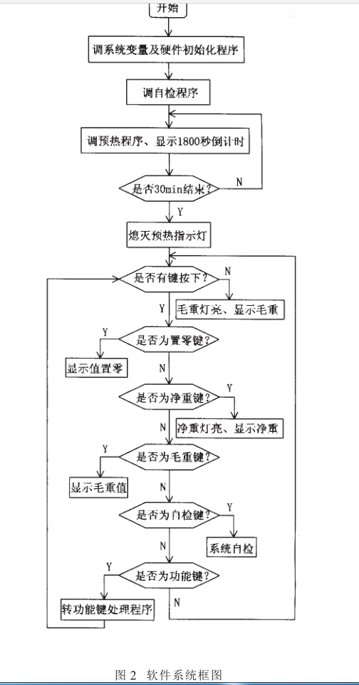 系统利用MCS-51单片机,采用汇编语言编制 系统应用程序。在软件设计方面具有以下特点:采用 动态窗口数据处理技术对测量数据进行软件滤波, 使系统不但具有较高的准确度,而且具有较强的稳 定性;可根据工作现场的温度自动进行温度补偿,以 确保系统在-30~+60 °C都具有较高的准确度和较强 的稳定性;可以对测量数据进行准确的分段线性补 偿,以确保测量的准确度;具有零跟踪功能,可以有 效抑制系统的零漂;具有数字去皮重的功能,可根据 实际需要对皮重值进行灵活的设定;可显示系统日 期及时间等;具有智能性,在系统出现错误时可以给 出错误信息提示,以方便用户的使用及维护。