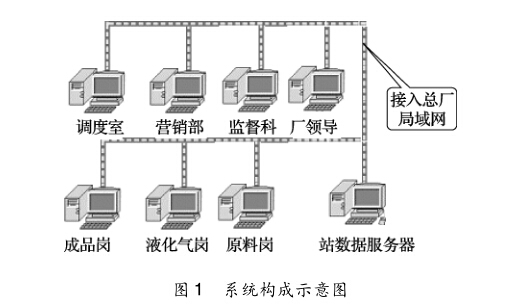 该系统由两部分构成:软件部分油品站已经开发 完成,需在各岗位设一台工作终端,站上设一台数据 服务器,并将该服务器接入总厂局域网,以便总厂相 关科室和领导能够查看油品信息,及时调度指挥生 产。示意图如图1。