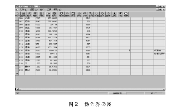 ②显示罐区全貌功能:操作记录主要用于岗位操作 人员填写原始数据,输出操作报表,但对于生产管理 人员来说,查询报表显然比较麻烦,罐区全貌就可以 简洁直观地显示各类油品的所有信息,并通过不同的 颜色反映现场生产动态等,使管理人员对生产的实际 状况一目了然。